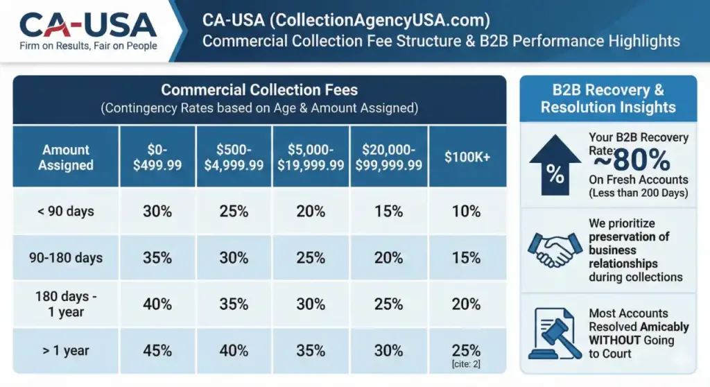 | Need a Commercial Collection Agency? Contact Us Serving Hundreds of Businesses !Easy to use • Fully Compliant with Federal and State Laws • USA Citizens-Only Team • 24×7 Secure Portal • High Recovery Rates • Over 20 years Experience • Free Commercial Credit Bureau reporting • Low fee • Highly Rated ! |